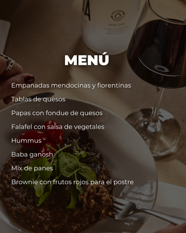 Todo acompañado de un tapeo bien Cru: empanadas, papas rústicas, quesos, hummus, falfel y brownie para cerra la noche